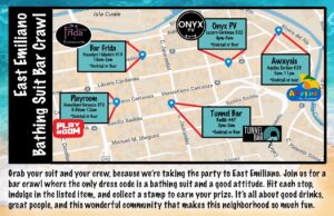 Grab your site and your crew, because we’re taking the party to East Emiliano. Join us for a bar crawl where the only dress code is a bathing suit and a good attitude. Hit each stop and indulge in a beer or cocktail – and collect a stamp to collection your prize at your final stop. It’s all about good drinks, great people, and this wonderful community that makes the neighborhood so much fun!